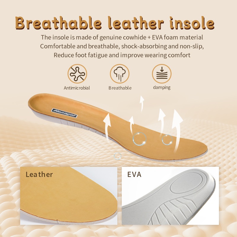 Tikros karvės odos + EVA putų vidpadis – kvėpuojantis, amortizuojantis ir neslidus. Išlaiko pėdų gaivumo jausmą mylia po mylios.