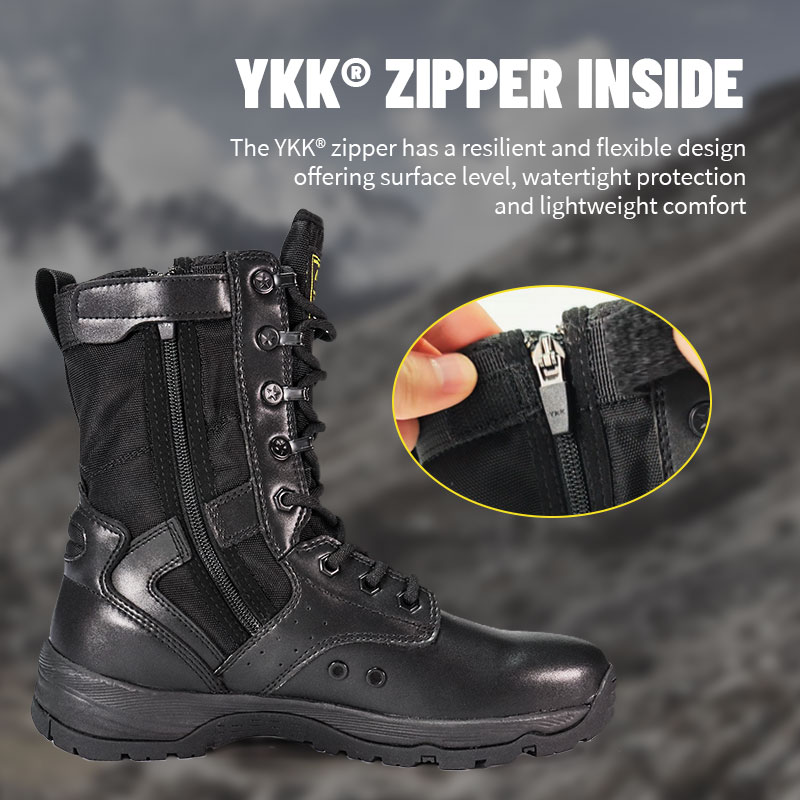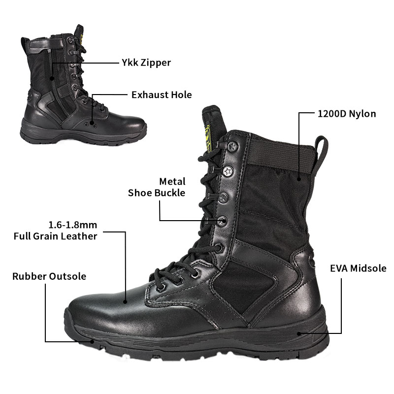 Sukurti kariškiams ir lauko entuziastams, pilno guminio pado policijos batai yra patogūs, apvyniojami ir labai stabilūs nelygioje vietovėje. Gliužuotas liežuvis išlaiko šiukšles ir išlieka centre, o patvari zomšos ir nailono viršus atlaiko sudėtingas sąlygas. YKK užtrauktukas leidžia lengvai užsidėti ir nusiimti, todėl galite susikoncentruoti ties būsima misija.