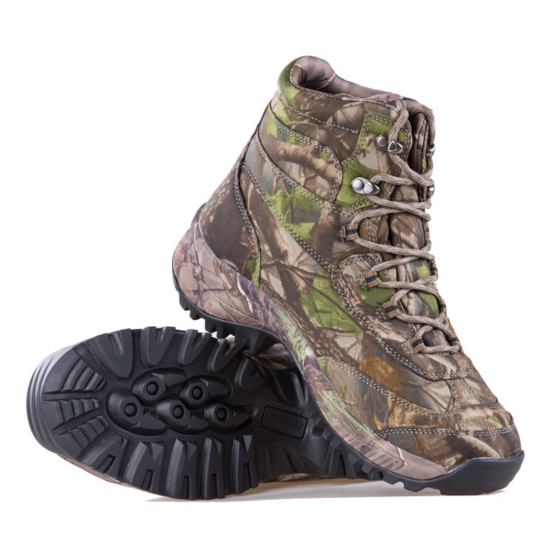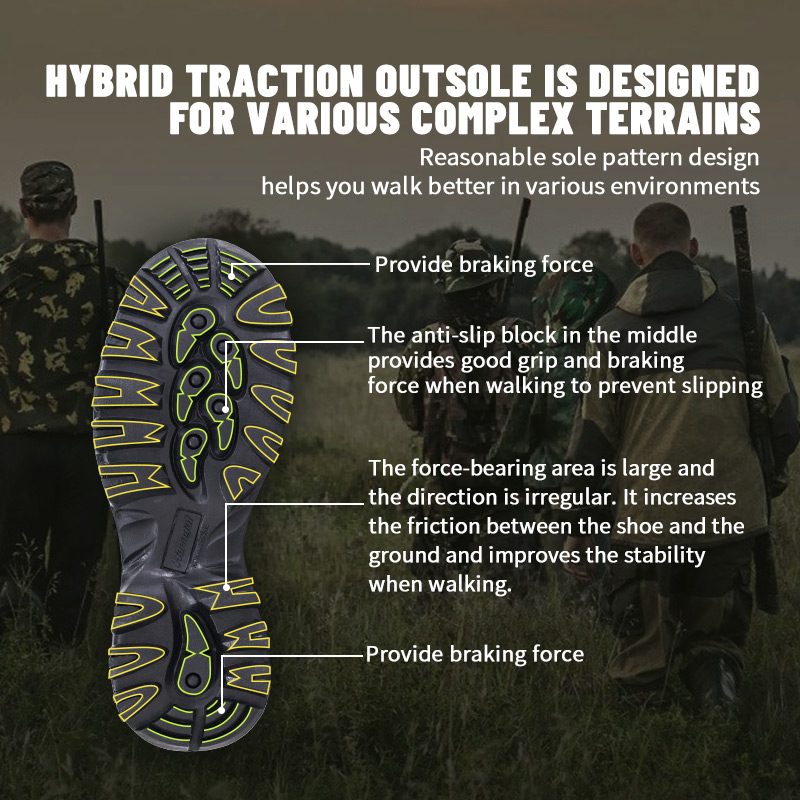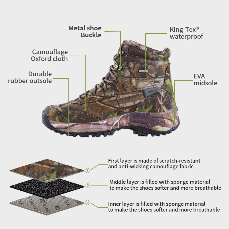 ①Poliyou labai tamprus, drėgmę sugeriantis vidpadis išlaiko vidų sausą. ②EVA tarppadis, apvyniotas kamufliažiniu audiniu, amortizatorius ir amortizatorius. ③ Patvarus guminis padas, neslidus ir atsparus dilimui.