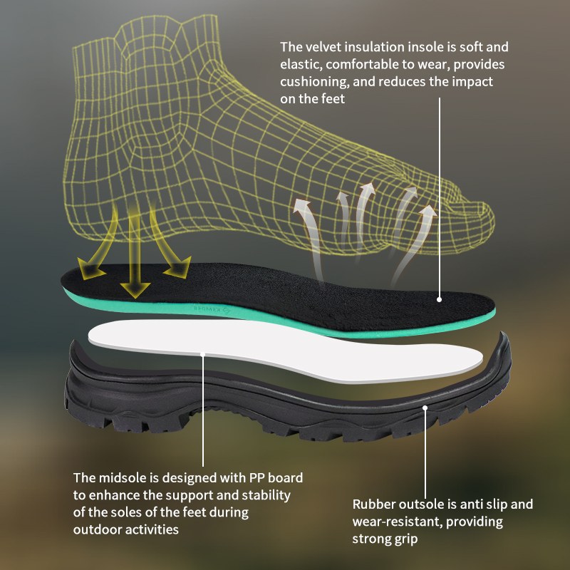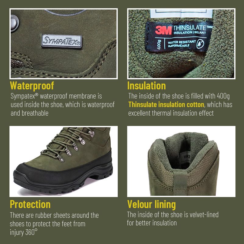 Šiuos „Sympatex“ vandeniui atsparius izoliacinius „Thinsulate“ medžioklinius batus galima pritaikyti pagal spalvas, medžiagas ir detales, kurių MOQ yra 800 porų, idealiai tinka bendradarbiauti su prekės ženklais ir grupiniams pirkimams. Ir šie medžiokliniai batai turi šiuos privalumus: